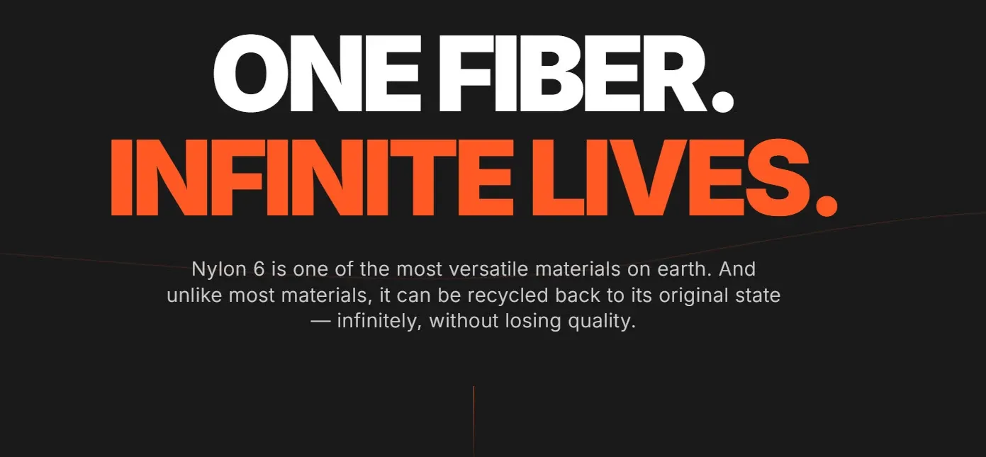 Nylon six is one of the most versatile materials on earth. And unlike most materials it can be recycled back to it's original state —infinitely. Without losing any of it's quality.